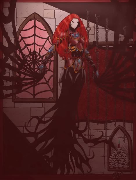 The Crimson Weaver of Subtle Venoms is among the most intelligent and cagy of the Deathlords. She operates out of the Chrysalis of Steel Becoming, which is located firmly in the Underworld but near enough to several large shadowlands to be useful, unlike the Thousand. She appears as the wraith of a slim-figured woman clad in close-fitting crimson armor with flowing skirts that twitch unnaturally as she seems to hover about her citadel with a faint skittering noise the only suggestion that she is in fact touching the floor. She has a mane of fire-red hair that is her chief source of personal vanity, as she obscures her face behind an excuisitely crafted white porcelain mask that depicts a severe-looking woman of stark beauty in her forties or so.